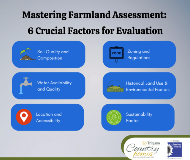 - Sustainability in farmland assessment assesses the land’s ability to support agriculture while minimizing environmental impact. This factor analyzes practices like soil health maintenance, water conservation, and responsible chemical use.